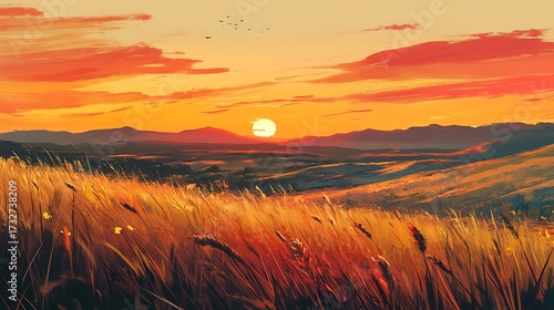 Golden sunset paints rolling hills and tall grass with warm, vibrant hues