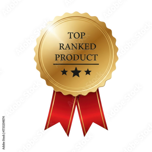 Golden top ranked product award badge with red ribbons isolated on transparent background