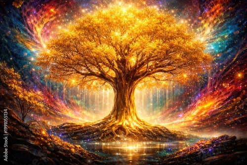 Golden tree fantasy artwork with vibrant abstract background texture