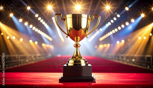 Golden trophy on a red carpet under spotlights