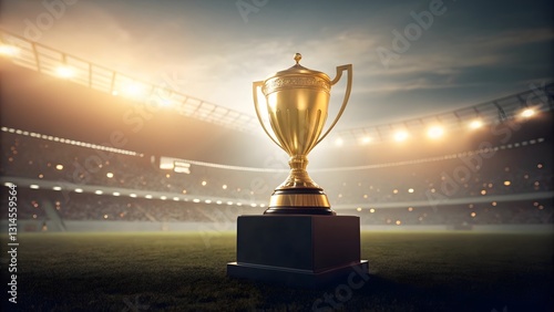 Golden Trophy on Pedestal in Stadium with Dramatic Lighting
