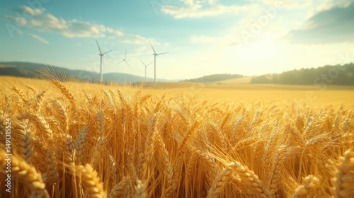 Golden Wheat Field with Wind Turbines Under Summer Sun
