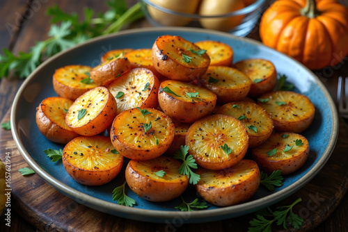 Golden-brown potato slices piled on a blue plate, garnished with fresh green herbs, on a wooden table with a small pumpkin.