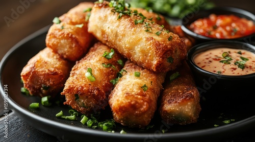 Golden-Fried Rolls Garnished with Fresh Herbs and Accompanied by Dipping Sauces