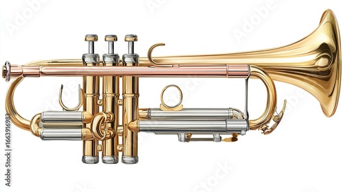 Gold-toned trumpet, side view, polished metal, valves, bell, musical instrument
