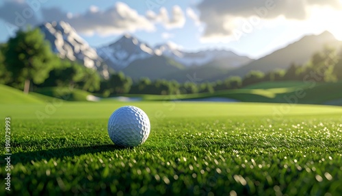 Golf ball on green, mountain backdrop, clear sky, sunny day