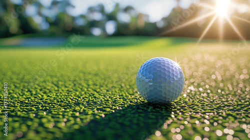 Golf ball on the course during a beautiful day. Promoting a new season, league, invitational, charity event, tournament, scramble, championship, challenge, or anything related to the topic of golf.