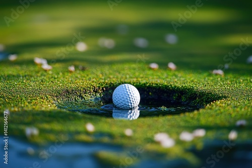 Golf ball resting in a water-filled hole on a lush green course, creating ripples and a sense of calm and precision.