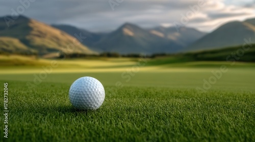 Golf Ball Resting on Green Grass With Mountains in the Background During Golden Hour