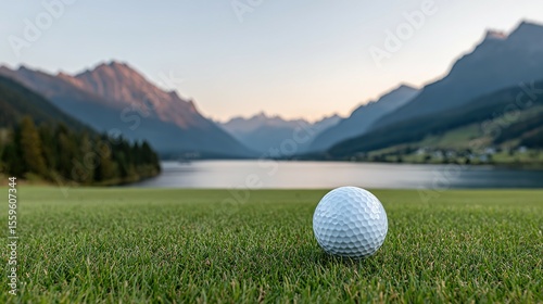 Golf ball rests on a grassy fairway with a lake and mountains in the background.