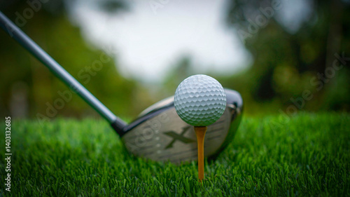 Golf clubs and balls on a green lawn in a beautiful golf course with morning sunshine.