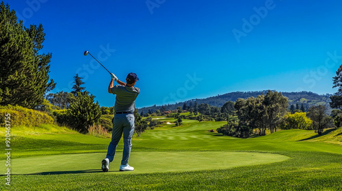 Golfer is focused while making a swing on a picturesque golf course in the sunshine
