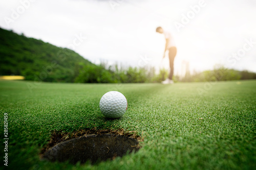 Golfer putting golf ball approach to the golf hole on the green golf.