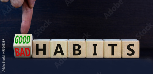 Good or bad habits symbol. Turned wooden cubes and changed concept words Old habits to New habits. Beautiful grey table grey background. Business old or new habits concept. Copy space.