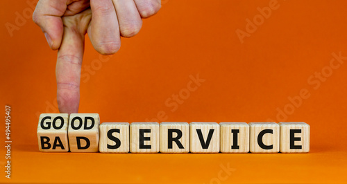 Good or bad service symbol. Businessman turns cubes and changes words bad service to good service. Beautiful orange table orange background. Business good or bad service concept, copy space.