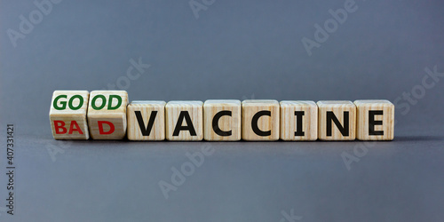 Good or bad vaccine symbol. Turned a cube and changed words 'bad vaccine' to 'good vaccine'. Beautiful grey background, copy space. Covid-19 and medical good vaccine concept.