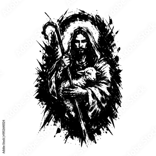 Good Shepherd Jesus holding a lamb with staff in expressive grunge ink style