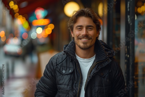 Good-looking man, smiling, wearing black jacket and white t-shirt.