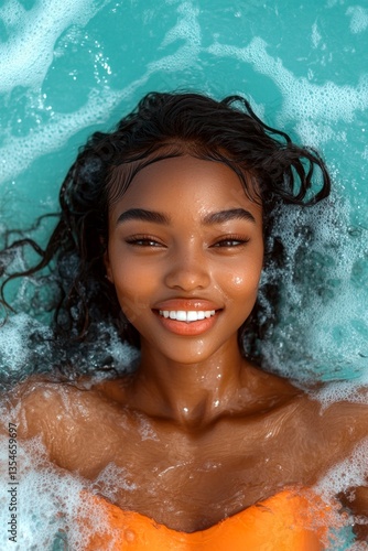 Gorgeous and hot happy black young woman in orange enjoying turquoise sea, splashes around her. Bright Ñommercial style. Happy stress-free holiday getaway concept artwork art.
