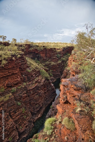 Gorgeous Dales Gorge in Karijini National Park in Western Australia. Beautiful lookout point at a canyon. Western Australia trekking adventures. River formed deep canyon with layered rock formations