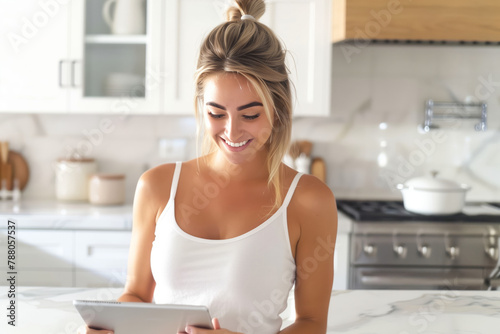 Gorgeous white american housewife blonde hair ponytail smiling while looking at her tablet in the kitchen, wearing white tank top