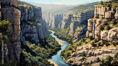 Gorges du Ardeche - canyon, river, landscape, cliffs, nature, wilderness, scenery, outdoors, beautiful, valley, rugged, rock formations, greenery, sunlit