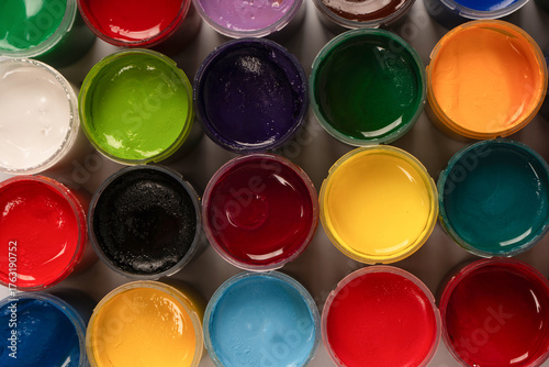 Gouache colorful paints set. Jars of gouache paint isolated on a white background.