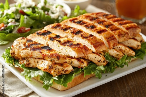 Gourmet Cajun chicken panini with pepper jack cheese served with romaine Caesar salad on a white plate
