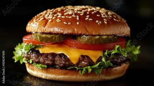 Gourmet cheeseburger with tomato, pickles and lettuce