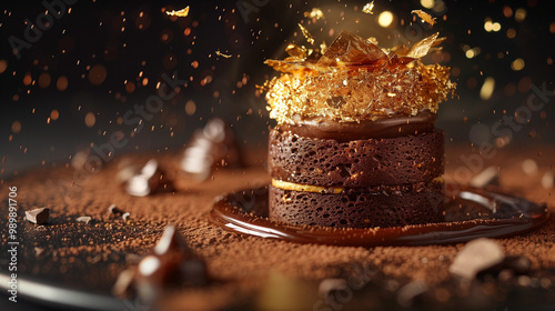 Gourmet Chocolate Cake with Gold Leaf and Caramel Decoration. A rich chocolate cake layered with caramel and topped with gold leaf, surrounded by cocoa powder and chocolate chips, creating a luxurious