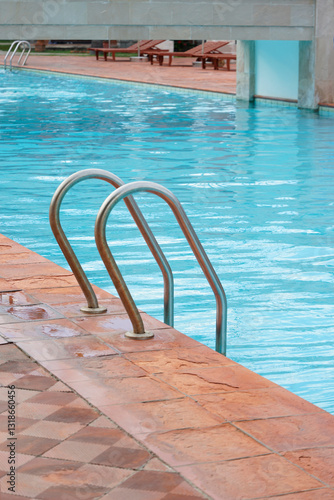 Grab bars ladder in the blue swimming pool. Stainless steel swimming pool ladder.