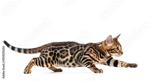 Graceful Bengal cat in dynamic stride across a clean white background, showcasing its agility