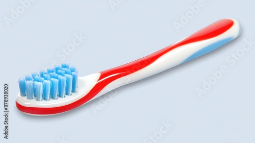 Gradient photo of a toothbrush with toothpaste placed diagonally on a light blue background.