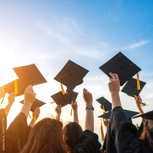 Graduating students celebrating with caps in the air
