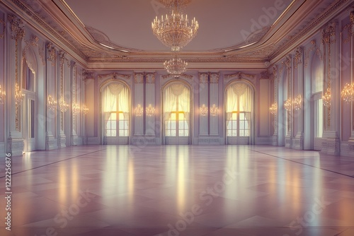 Grand ballroom, elegant interior, sunlight, dance floor, event venue