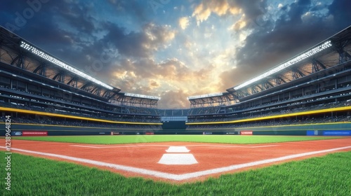 Grand baseball stadium field diamond daylight view, modern public sport building 3D render background.