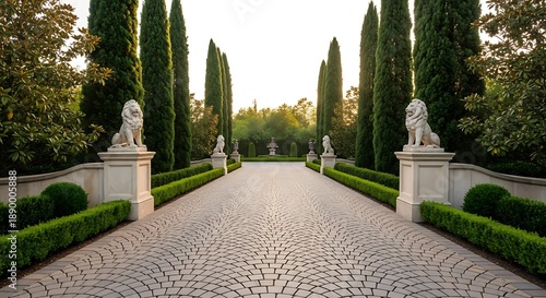 Grand Entrance Driveway with Cypress Trees and Lion Statues image