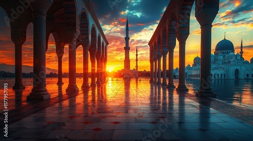 Grand mosque sunrise reflection through arches.
