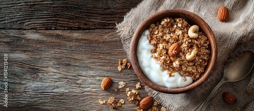Granola Cereal With Nuts And Yogurt On A Old Wooden Table