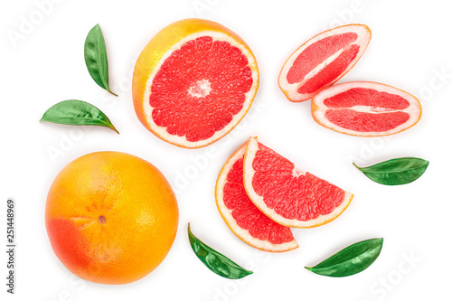 Grapefruit and slices with leaves isolated on white background. Top view. Flat lay pattern