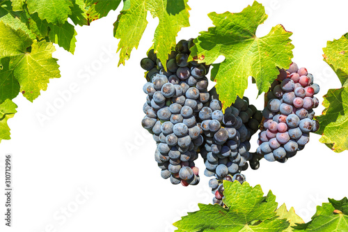 Grapes are ready for harvest. Ripe red grapes on branch with leaves isolated on white background. Seasonal background with copy space.