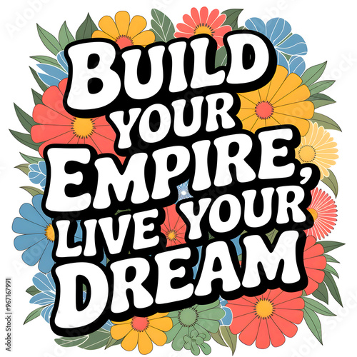 Graphic affirmation quote retro groovy design "Build your empire live your dream" Inspirational saying, positive affirmation.