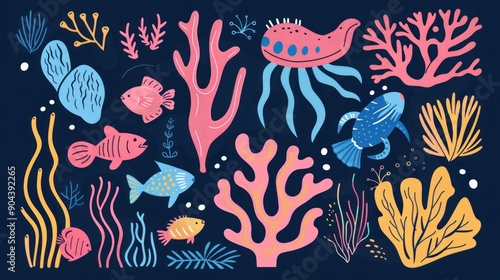 Graphic illustration simplifying vibrant ocean life focusing on coral structures