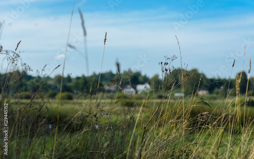grass closeup against the sky and fields