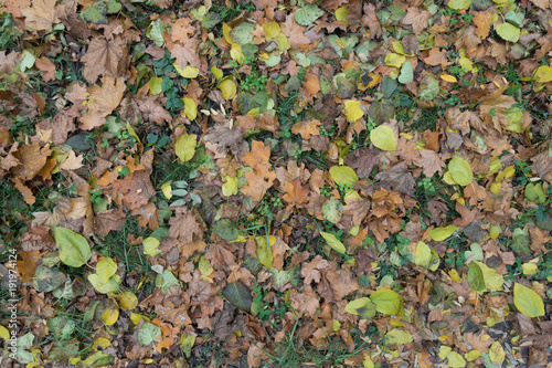Grass covered with colorful fallen leaves in autumn