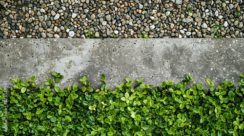 Grass, plants leafs and gravel concrete background. Decorative exterior concept for floor or wall pattern of gravel sandstone concrete texture with green grass and plant leafs abstract background.