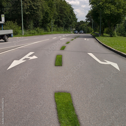 Grass stripes on road
