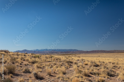 Grassy plain with distant mountains, snow, Socorro New Mexico, horizontal aspect