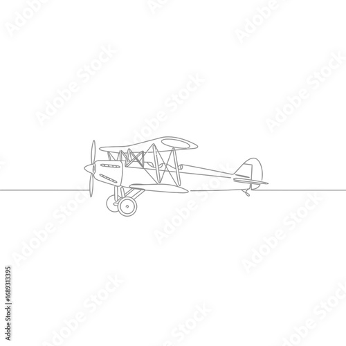 Gray Line Drawing of Vintage Biplane on White Background