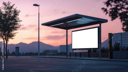 gray metal bus shelter with a large blank billboard, situated on a paved plaza at dawn, featuring a soft, peachy-pink sky